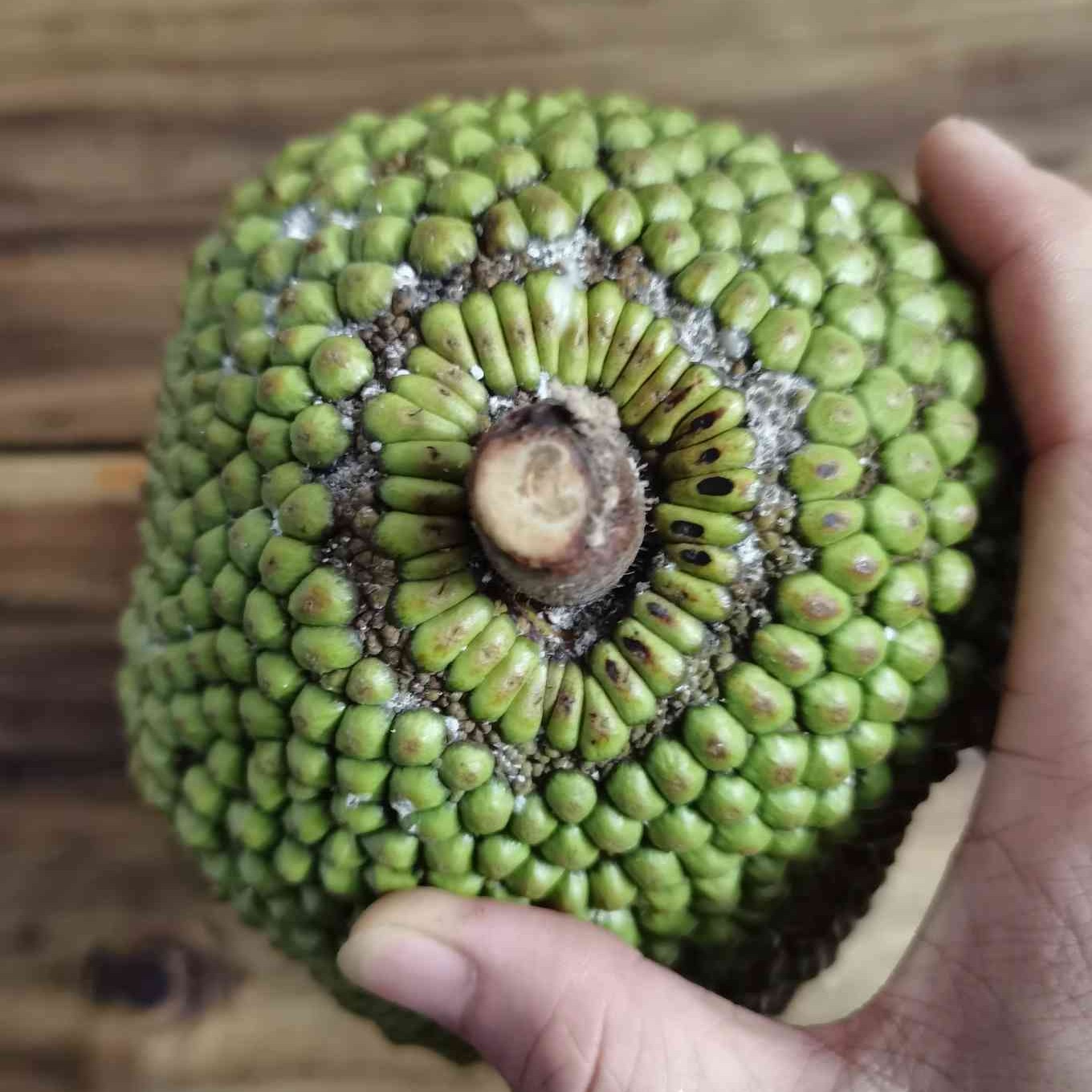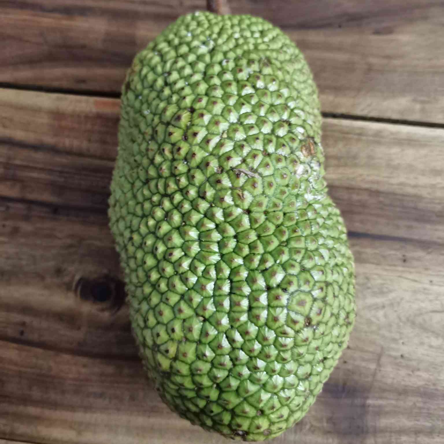 It resembles a smaller jackfruit, with green to yellowish-brown skin covered in small spikes when mature.