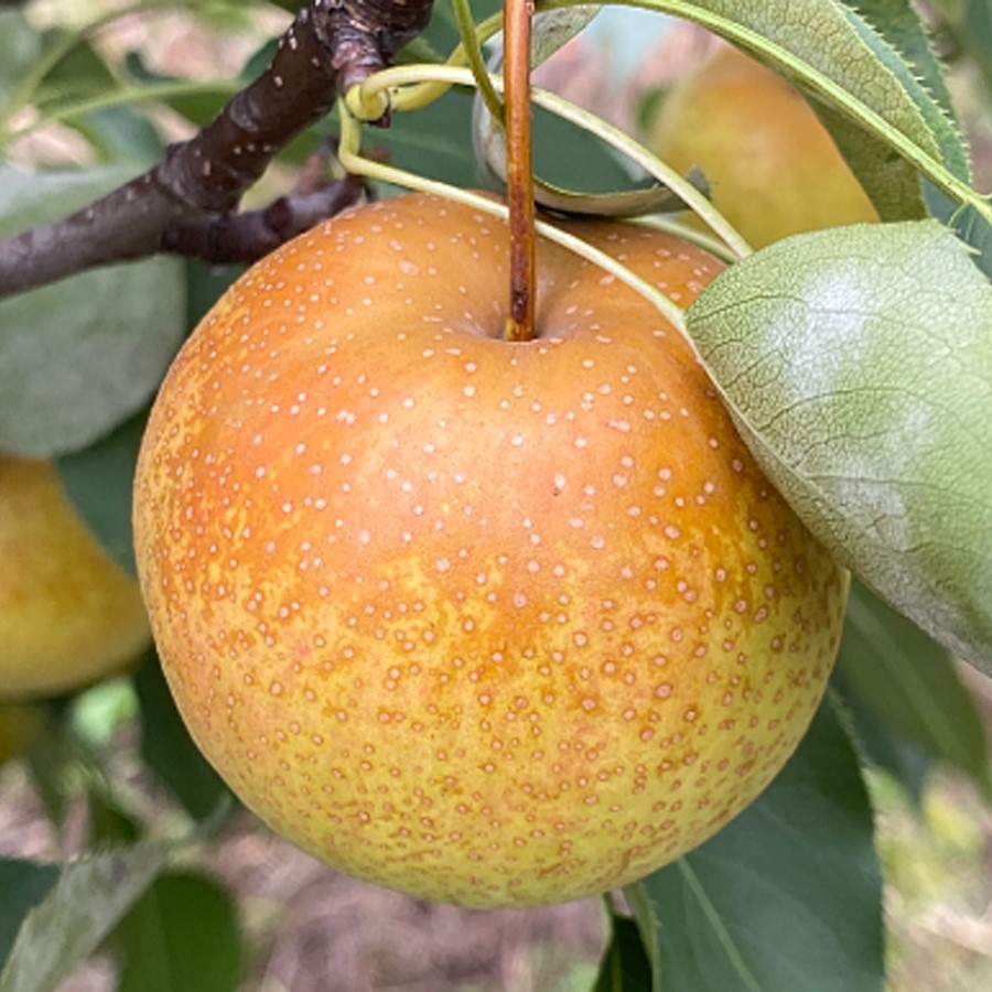Huagai Pear has nearly spherical fruits, with each pear weighing between 150 to 200 grams. The flowering period occurs in May, and the fruits ripen in August.