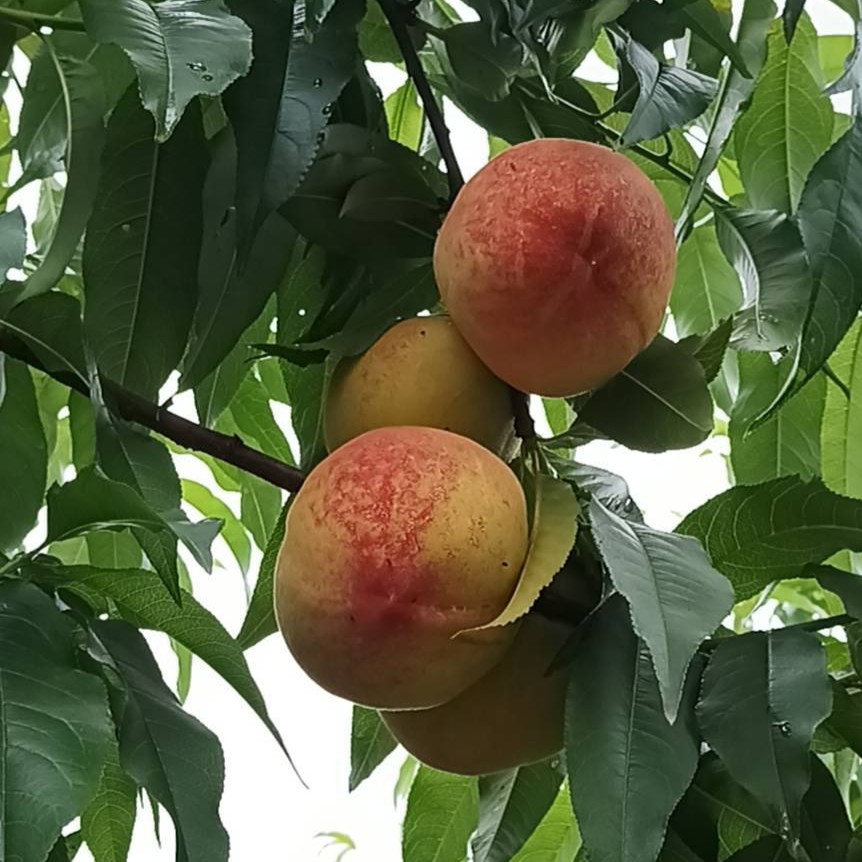 Jinxiang Yellow Peach has round fruit with a rounded, flat apex, symmetrical halves, and an inconspicuous suture line. The average fruit weight is 193 g, with larger fruits reaching 270 g. The skin has a golden-yellow base color; when bagged, the sun-exposed side develops a red blush, while unbagged fruit shows a deep red color on the sun-facing side. The fuzz is sparse, and when fully ripe, the skin can be peeled. The flesh is golden yellow with a firm, non-melting texture. The soluble solids content is around 10%, with a sweet, slightly tart flavor, medium juiciness, and a strong aroma. The variety is clingstone.